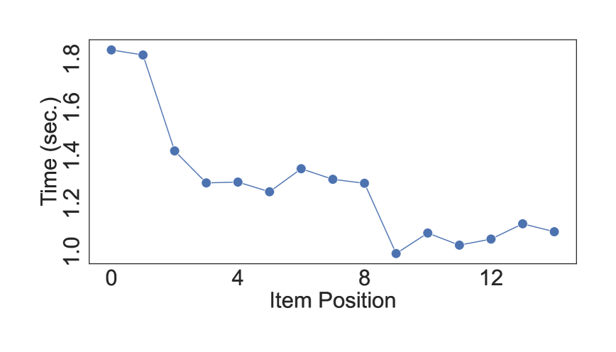 We record several signals related to participants’ page examination behavior and their interaction data, such as mouse hovering, scrolling, viewed items, clicks, and time spent on the task. To gain a more accurate estimate of RT, we ask the participants to click on a Start button after reading the instructions. The search result page appears only after the Start button has been clicked. We compute the task completion time from the moment the workers click the Start button.