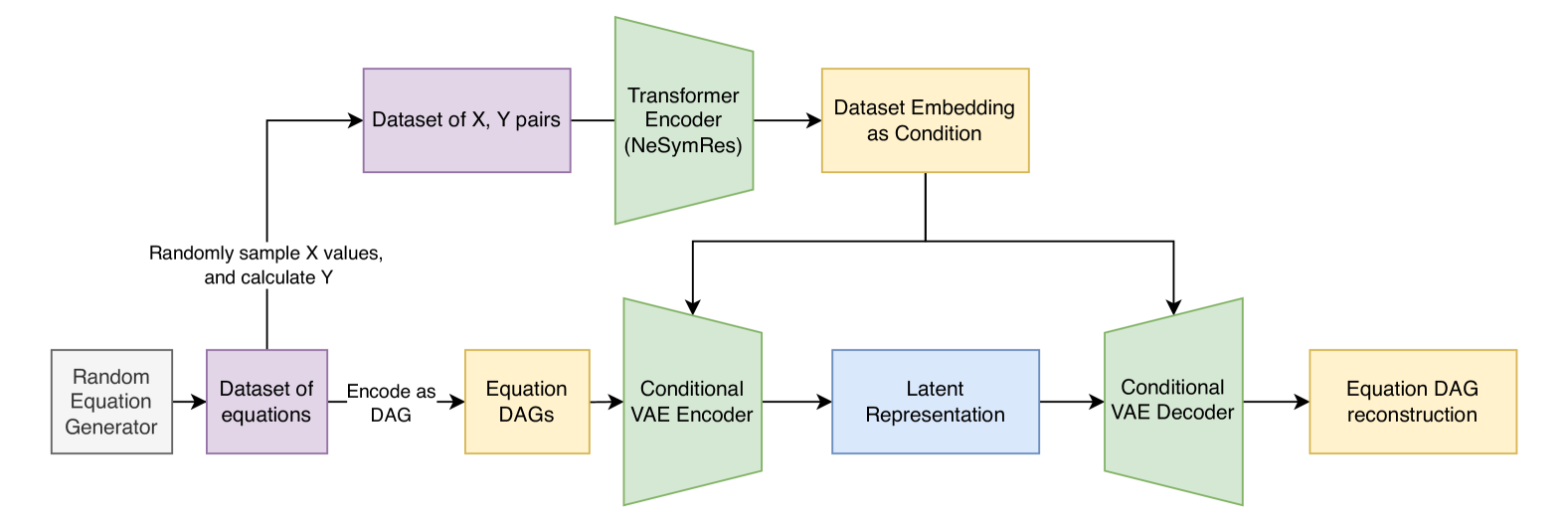 In this work, we introduce Graph-Eq, a conditional VAE-based deep graph generative model for learning representations of mathematical equations. Graph-Eq is trained on a large number of randomly generated equations in a completely unsupervised manner to learn a rich latent representation. Once trained, the latent space learnt by Graph-Eq can be explored using black-box optimization techniques to discover equations that best fit tabular datasets. The architecture of Graph-Eq is illustrated in Figure 1.