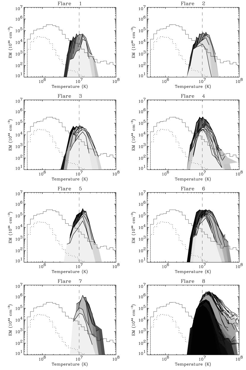 Fig. 5 shows that at any flare phase the EM(T) is typically quite narrow, practically independent of the flaring region morphology, and covers a temperature decade around K. It is much narrower than any EM(T) of the whole Sun. Exceptions are the EM(T)’s obtained for flare 8, the most intense one, which shows significant amounts of hotter plasma, at temperatures up to K. The EM(T) reaches for this flare maximum values cm-3. Hot plasma at temperatures above 30 MK is present in flares more intense than M1.1 (flare 3).