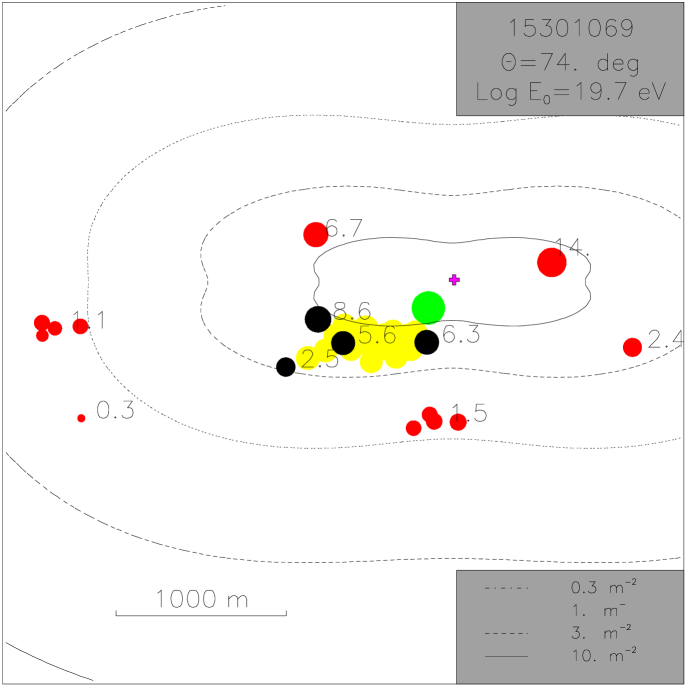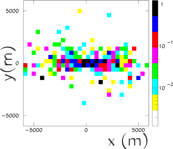 Cosmic ray induced HAS are different from vertical showers mainly because they consist largely of muons which are produced far from ground level. The particle density profiles for HAS induced by protons or heavy nuclei display complex muon patterns at the ground which result from the long path lengths traveled by the muons in the presence of the Earth’s magnetic field [12, 13]. These patterns are difficult to analyse [14] and invalidate the conventional approach used for interpretation of low zenith angle showers (), which is usually based on the approximate circular symmetry of the density profiles. The analysis of HAS produced by cosmic rays requires a radically different approach such as the one presented in this work.
