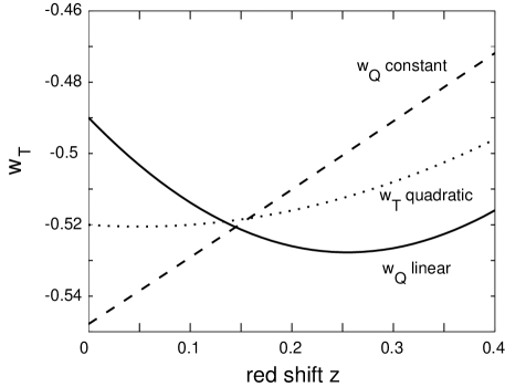 Consequently, it is not surprising that SN measurements of provide stronger constraints on at low than at high . In particular, if all cosmic parameters other than are fixed, there is a particular, relatively low value of for which is most tightly constrained. This value of is clearly seen in our numerical results and was noted independently by [11, 26]. For example, Figure 1 shows the EOS for three models each of which is obtained by best fit to for a fiducial model using one of three fitting assumptions: (1) that the dark EOS is constant; (2) that the dark EOS is linear ; and, (3) that the total EOS is quadratic . While the real degeneracy is stronger than what is seen in the figure, we have chosen three examples to illustrate the existence of and . As can be seen, the fits disagree significantly for far from , but all fits agree near .