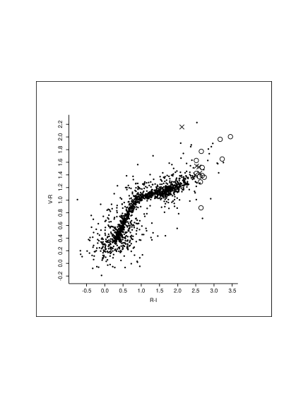 The low mass and brown dwarf spectral library was provided by Chabrier and Baraffe and consists of 105 theoretical spectra. They correspond to three sets of models which attempt to account for differences in the formation and settling of dust in the atmospheres (Chabrier et al., 2000). In this paper 53 of these models are used, corresponding to objects with masses (K), to select low-mass stars and/or brown dwarf candidates. These template spectra were compared to our broad-band SED and over the 0.25 square degree area covered in five passbands a total of 18 candidates were identified with (all fainter than ), with 13 being robust detections. All of the candidates are matched to spectra with effective temperatures between 1700K and 2800K, corresponding to masses roughly between 0.05 and 0.1 M⊙, close to the hydrogen-burning limit. Their position on a diagram is shown in Figure 9. The objects with seen on this figure that have not been selected as low mass or brown dwarf candidates were identified as M6V stars. Note that this class marks the transition between main sequence stars and low mass stars. Comparing the results of the -analysis with those obtained selecting objects redder than , roughly corresponding to the criterion adopted by Zaggia et al. (1999), one finds a significant contamination (75%) by other types of objects.