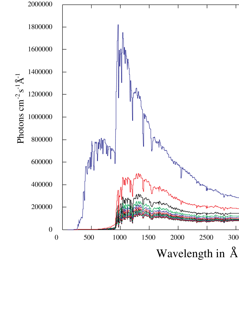 I obtained the temperature of each star by ascertaining its effective temperature (as a function of that starโs spectral class) according to the prescription of Allen (2000, page 151, Table 7.6), for main sequence stars, and (same source), Table 7.8 for supergiants. Again, giants have no separate listing, for the hot stars that are of greatest interest; giants were therefore treated as main sequence stars for the present purposes. For the very hottest stars I adopted the following temperatures, adapted from Lang (1992, page 137): O4, 48,000ย K; O5, 44,500ย K; O5.5, 43,000ย K; O6, 41,000ย K; O7, 39,000ย K; O7.5, 38,000ย K; O8, 35,900ย K; O9.5, 34,600ย K. The few stars that are identified simply as O were assigned effective temperatures of 50,000ย K, the hottest Kurucz model. At the request of the referee, I re-ran my program (almost 13 hours on a Macintosh G4 desktop) to see if it makes any difference if I assign spectral class O9 to these same few stars instead. The difference is detectable in the plot of the resulting integrated spectra, below 1000 ร ; but only barely detectable; these stars are few and faint.