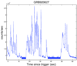 Most GRBs are highly variable. Fig 1 depicts the light curve of a typical variable GRB (GRB920627). The variability time scale, , is determined by the width of the peaks. is much shorter (in some cases by a more than a factor of 100) then , the duration of the burst. Variability on a time scale of milliseconds is seen in some long bursts [20]. However, not all bursts are variable. We stress that our discussion applies to variable bursts and it is not applicable to the small subset of smooth ones.
