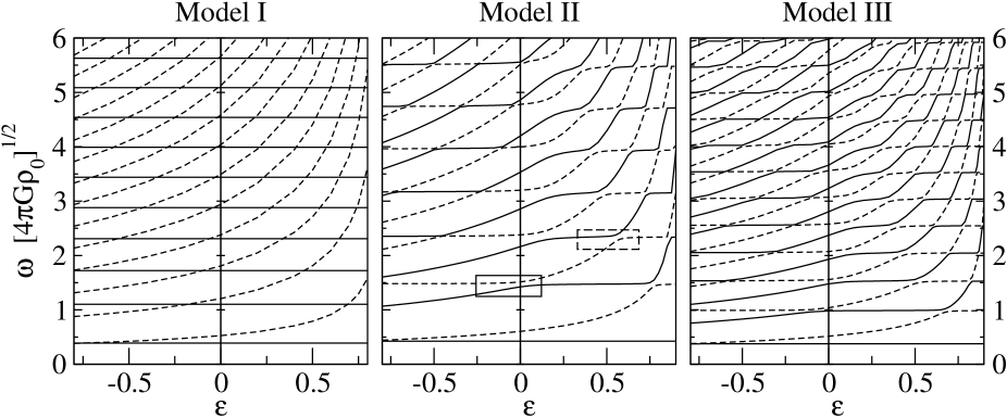The results for the mode-frequencies as functions of for the three background models are represented in Fig. 5. In the case of the non–stratified model I, we observe the predicted (sect. 4.3) decoupling, and in particular the independence of the “ordinary”–type modes of entrainment. Because of this decoupling the respective frequencies of the two mode families can simply cross each other when is varied. In the generic stratified models (model II and III), the modes of the doublets are coupled and avoided crossings result when mode–frequencies come to close to each other, as also found recently by Andersson et al. (2002). In this process of avoided crossing the two modes seem to exchange some of their respective properties of being dominantly “co-” or “counter-moving”, as can be seen in Fig. 6), and they also can exchange their number of radial nodes, as we see in the avoided crossing of the p and p in Fig. 7.