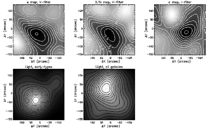 When we aligned the images, we discovered that the frames from 1999 were rotated with respect to those taken in 1998 by 0.2420.005 degrees. The small rotation caused problems when we combined the data from 1998 and 1999, as periodically varying ellipticities were introduced when one set of images was rotated with respect to the other. We therefore performed the weak lensing analysis on just the 1999 -band data, since these were both deeper and taken during better conditions than those from 1998. The full data set was instead used when we estimated the light from the galaxies in order to determine the M/L ratios of the clusters.