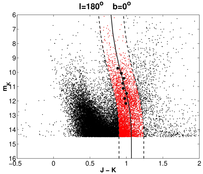 The red clump giants can be directly extracted using the fitted trace. Sources with a within 0.2 mag of the center of the fitted red clump line were extracted, and the star counts were then obtained. The width was determined after a number of trials and is a compromise between the necessity to avoid other stars types but include most of the red clump giants. If too small a width were chosen then any error in the determination of the position peak would lead to a loss of sources at that point and so reduce the measured density. Using this width, most of the red clump giants for low extinction regions will be extracted. However, where the extinction is somewhat patchy (for instance in negative latitudes) the strip broadens and a significant number of stars are lost. Therefore, those regions have been excluded from the analysis.
