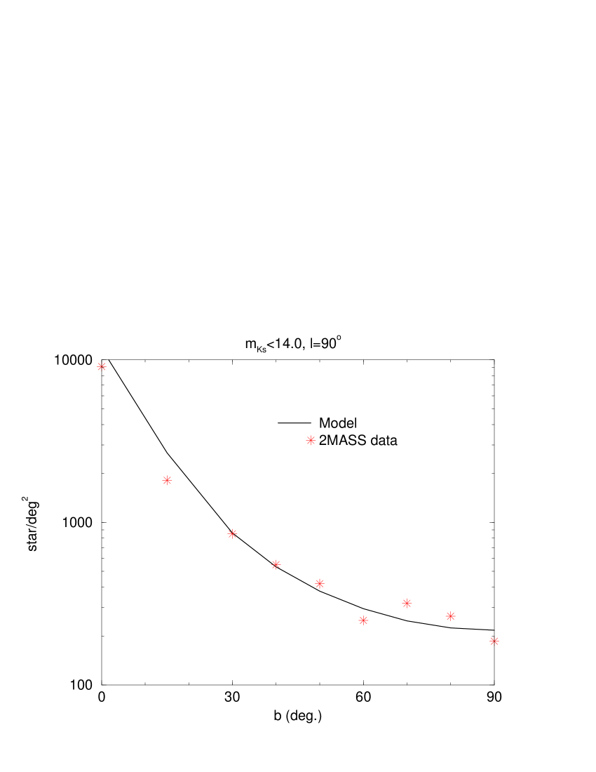 We have ignored the contribution of the spiral arms since in the outer Galaxy their contribution to the star count is small and even then it will be at the brightest magnitudes being considered here, giving negligible contribution for .