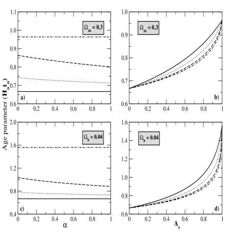 In order to constrain the cosmological parameters from the age estimates of the above mentioned high- objects we take for granted that the age of the Universe at a given redshift is bigger than or at least equal to the age of its oldest objects. In this case, the comparison of these two quantities implies a lower (upper) bound for (), since the predicted age of the Universe increases (decreases) for larger values of this quantity (see Fig. 1). Note also that the age parameter is an almost insensitive function to the parameter but that it depends strongly on variations of . This means that age considerations will be much more efficient to constrain the sound speed than the values of the parameter .