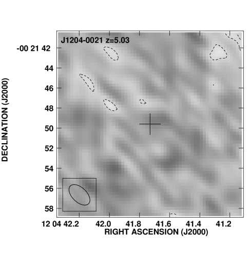 J0836+0054 (z=5.82) This source is clearly detected at 1.4 GHz with a flux density of mJy. Gaussian fitting sets an upper limit to the source size of at 1.4 GHz. J0836+0054 is also detected at 5 GHz with a flux density of Jy. The implied radio spectral index is –0.8. A second radio source with SmJy is detected 10″ south of the QSO. Deep optical and near-IR imaging of this field suggests that this second source is associated with a lower redshift galaxy, and unrelated to the QSO (Rusin et al. in prep). J0836+0054 is not detected at 250 GHz with a upper limit of 2.9 mJy.