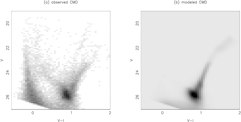 Because of the failure of the constant SFR model, a more sophisticated fit for the history is necessary. The statistical basis behind this procedure and tests of its accuracy were given by Dolphin (2002); we merely summarize here. We produce a large number of βsingle-populationβ synthetic CMDs, each containing only stars with limited ranges (0.1 dex) of age and metallicity. These CMDs are generated using a combination of theoretical isochrones, IMF, binary function, distance, and extinction distribution. Observational errors (from photon noise and blending) are simulated by using the completeness, photometric bias, and photometric scatter (all functions of color and magnitude) measured in the artificial star tests.