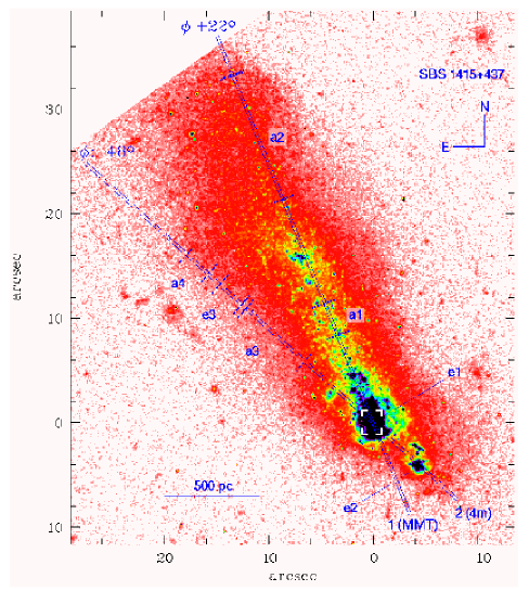 It is seen from the continuum-subtracted H images (Fig. 2) that star-forming activity in SBS 1415+437 is primarily occurring in regions e1 and e2, with some additional faint H emission present in region e4. However, the available narrow-band data are not deep enough for tracing faint H emission in other regions of the LSB component, such as in regions a1, a3 and e3 where H and H have been detected spectroscopically (Table 3). The latter fact suggests that some low-level SF may be present at various locations within the LSB component.