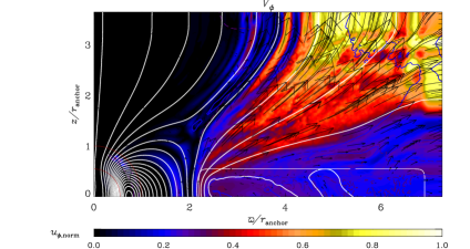 The structured outflow is driven by a combination of different processes. A significant amount of angular momentum is transported outwards from the disc into the wind along magnetic field lines, especially along the strong lines within the conical shell (see Fig. 2, right panel). The magnetic field geometry is such that the angle between the rotation axis and the field lines threading the disc exceeds at the disc surface, which is favourable for magneto-centrifugal acceleration (Blandford & Payne 1982). However, the Alfvén surface is so close to the disc surface at the outer parts of the disc that acceleration there is mainly due to the pressure force. In the conical shell, however, the outflow is highly supersonic but sub-Alfvénic, with the Alfvén radius a few times larger than the radius at the footpoint of the field lines at the disc surface. The lever arm of about 3 is sufficient for magneto-centrifugal acceleration to dominate (cf. Krasnopolsky et al. 1999). The inner cone has very low angular momentum and the magnetic lines are inclined to the axis by less than so that the stellar wind can only be pressure driven. This picture is confirmed by looking at the ratio of magneto-centrifugal to pressure forces, which is much larger than unity in the conical shell. This is also the region where magnetic pressure produced by the toroidal field exceeds gas pressure, indicating that the outflow in the conical shell is confined by the toroidal field.