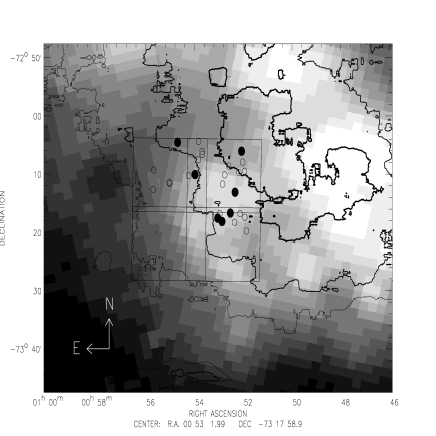 On January 7, 1998 (JD 2450821.4) we obtained broad and narrow band photometry at ESO La Silla with DFOSC on the Danish 1.5m111http://www.ls.eso.org/lasilla/Telescopes/2p2T/D1p5M. for three selected SMC fields. One field contained three of the seven ESHCs. We used BVRI and HH filters with exposure times of 60s, 30s, 30s, 30s, 600s and 600s, respectively. The filters are the so-called ESO filters numbered 450, 451, 452, 425, 693, 697, respectively. The CCD is a LORAL 2048x2048 CCD with a pixel scale of 0.39 arcsec/pixel. The data have been reduced using QUYLLURWASI, the pipeline developed by one of us (JPB) around DoPhot for the PLANET (Albrow et al. 1998) collaboration. The absolute calibration has been done using Landolt standards taken during the observations. This leads to an absolute calibration accuracy of 2 % for stars brighter than , and of the order of 5 % for stars of . The field is so crowded that incompleteness starts to be severe at . This was determined from the observed distribution of stars on the main sequence. Details on the data and data reduction can be found in Stegeman et al. (2003).