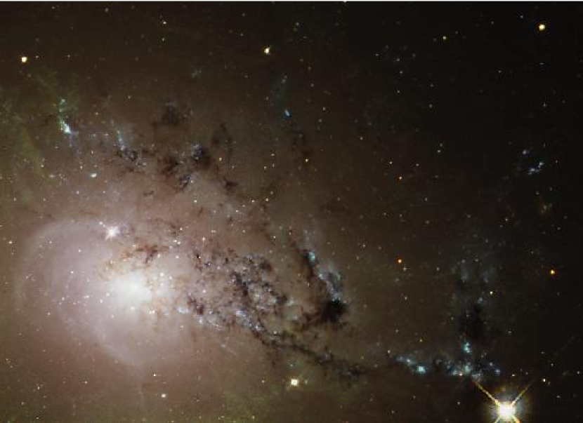 Many clusters also host optical emission-line nebulae within their cores that appear to be associated with the cooler () X-ray emitting gas (Fabian & Nulsen 1977; Ford & Butcher 1979; Cowie et al. 1983; Hu, Cowie, & Wang 1985; Heckman et al. 1989; Crawford & Fabian 1992; Donahue, Stocke, & Gioia 1992; Crawford 2003). One could even say that Carnegie Observatories initiated the study of cool gas in clusters. Hubble & Humason (1931) noted that NGC 1275, the central galaxy in the Perseus cluster, had a discrepant color index because of its strong emission spectrum, saying that “it could be classified as an elliptical nebula that has broken up without the formation of spiral arms.” Later, Baade & Minkowski (1954) noted that NGC 1275 was unusual among Seyfert galaxies because its emission lines were not restricted to the nuclear regions. Lynds (1970) eventually imaged this amazing H emission-line nebula using an interference filter. Figure 1 shows a recent Hubble Heritage close-up of NGC 1275, featuring a hint of spiral structure, complex dust lanes, and evidence for recent star formation.