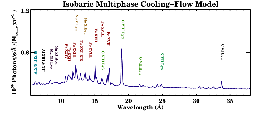 A recent breakthrough in X-ray astronomy is reframing the whole debate about cooling flows. In a simple, steady-state cooling flow one expects to see emission from gas over the entire range of temperature from to the sink temperature, whatever that may be. Because the thermal energy lost as gas cools from to is proportional to , the luminosity coming from gas within that temperature interval is expected to be . Thus, X-ray spectroscopy of the emission lines characteristic of gas at each temperature can be used to test whether is constant with temperature (Cowie et al. 1980). For example, we can use Fe XVII to track gas at K, O VIII to track gas at , and UV observations of O VI to track gas at K. Figure 2 shows the predicted spectrum if the cooling gas is assumed to be an inhomogeneous (multiphase) medium, as inferred from , that cools at constant pressure.