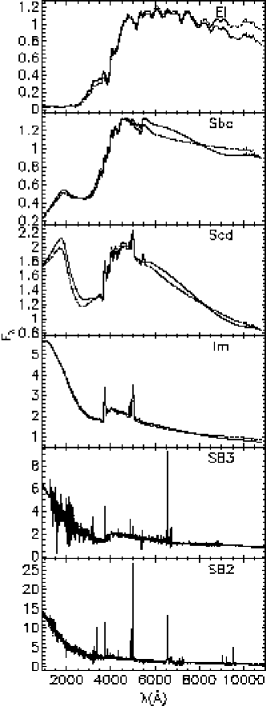 For faint galaxy samples like the ones presented here, and in general for ACS observations, the only options are SED-based techniques, for which a critical issue is the choice of the template library. At first sight it may seem most logical to use synthetic galaxy evolution models, like the Bruzual & Charlot (1993) ones (used in Hyper-z, Bolzonella, Miralles & Pelló 2000) or the Fioc & Rocca-Volmerange (1997) ones, since they take into account age effects, dust extinction, etc. However, simple tests quickly showed that the most effective SEDs for photometric redshift estimation are obtained from observations of real galaxies, e.g. a subset of the Coleman, Wu and Weedman (1980) (CWW) spectra augmented with two Kinney et al. (1996) starbursts ( Benítez 2000, Csabai et al. 2003, Mobasher et al. in preparation). But even these templates have shortcomings. A detailed comparison of the colors predicted by the CWW+SB templates and those of real galaxies in several spectroscopic catalogs show small but significant differences. We developed a method to trace these differences back to the original templates, and model them using Chebyshev polynomials, generating a new set of “calibrated” templates which produce much better results in independent samples. We show these new templates, together with the original extended CWW set in Figure 13. A detailed description of this technique will be given elsewhere.