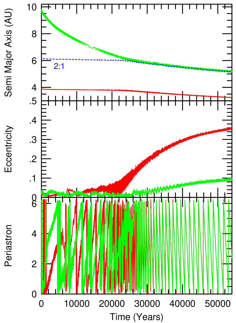 In the beginning, after the inner gap has completely cleared, only the outer planet migrates inward, and the eccentricities of both planets remain relatively small, (). After about 5000 yrs the outer planet has reached a semi-major axis with an orbital period three times that of the inner planet. The periodic gravitational forcing leads to the capture of the inner planet into a 3:1 resonance with the outer one. This is indicated by the dotted reference line (labeled 3:1) in the top panel of Fig. (2), which marks the location of the 3:1 resonance with respect to the inner planet.