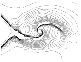 Figure 4a shows streamlines on the surface of the companion star in a semi-detached binary system with mass ratio 2; the companion is assumed to be two times heavier than the mass-accreting compact star. This mass ratio is taken to model a supersoft X-ray source. Figure 4b shows the accretion disc for the mass ratio of 2. Note that Figs. 4a and 4b are not the result of one calculation. In Fig. 4a the ratio of specific heats, , is assumed to be 5/3, i.e. an adiabatic gas, while in Fig. 4b, is adopted to obtain an accretion disc. In order for an accretion disc to be formed, some kind of cooling is necessary, and we mimic the cooling by lowering .