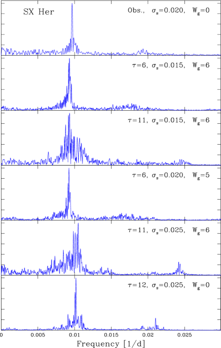 SX Her: Fourier amplitude spectrum top: of the smoothed LC, below: of synthetic LCs. BK projections, top: smoothed LC, below: sections of synthetic LCs with various smoothings and delays .