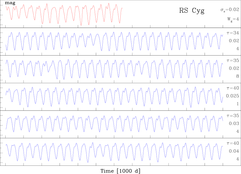 In Figure 7 on top we display the 15 cycles long LC for RS Cyg, superposed on a LC fitted with the smoothings , .