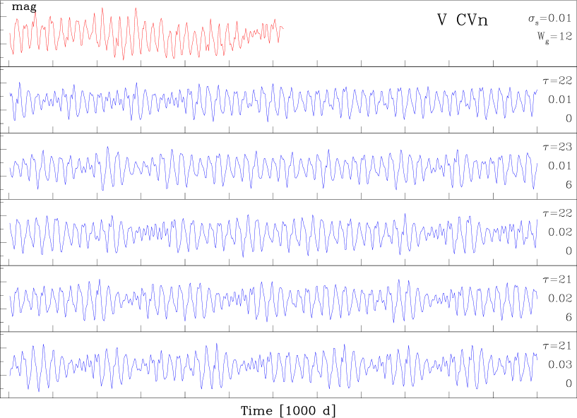 In a 3D reconstruction space the synthetic LCs definitely do not look like the LC. In 4D good looking synthetic LCs can be generated, although the reconstructions are not particularly robust. They appear possible only for a relatively narrow range of and only for a few values in the range 3 – 6 d. This relative lack of robustness is not very astonishing considering that, compared to its complexity, the LC is very short. For a good reconstruction we clearly need LC features to repeat over the span of the LC. In addition the amplitude of this star is only half that of the other 4 stars, so that the noise level is higher. For the same reasons we have had difficulty making reconstructions in 5D and 6D. However, the synthetic LCs are consistent with .