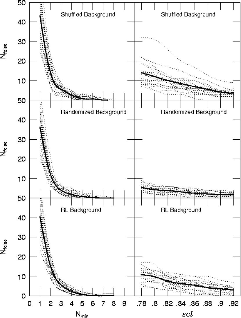 Figure 10 compares the variation of Nfalse with Nmin (left panels) and scl (right panels) for the RL, randomized and shuffled distributions. Each dashed line represents the variation of Nfalse for one of the 20 DPOSS plates tested. The solid line shows the mean variation on each panel. In order to compare the performance of the three different backgrounds we use Nfalse, as it is the only parameter to vary when estimating . The dispersion is basically the same for all distributions in the left panels, being slightly higher when the shuffled background is used. The right panels indicate the contamination estimate is lowest, and least sensitive, to the randomized background. The RL and shuffled distributions show similar results to each other (except for two outliers in the latter case). This suggests that the randomized background underestimates the contamination. The RL is a model representation of the angular distribution in a galaxy field. Nfalse smoothly decreases as we move to higher thresholds (given by Nmin and scl). However, the RL distribution might not properly represent variations in high density fields. We expect the correlation properties to vary for different DPOSS fields as they have different galaxy densities (Maddox, Efstathiou & Sutherland, 1996). As a full analysis of the correlation properties of all DPOSS fields is beyond the scope of this project, we decided not to use the RL distribution for this paper. Instead, the shuffled background is adopted to optimize our algorithms. It shows no large differences relative to the RL distribution, and is a model-independent representation of the background.