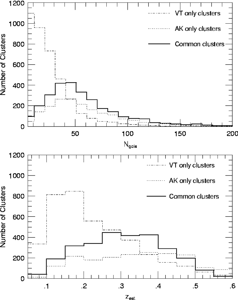 In Figure 15 we show the richness distribution for the VT and AK cluster candidates for different redshift bins. The top panel shows the richness distribution for the entire sample. Further considerations related to redshift and richness estimates are discussed in section 8, where we compare the current catalog to the previous NoSOCS cluster catalog and to other surveys.