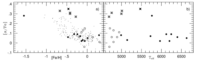 In this figure and in most of the following ones we have identified five candidate thick-disk stars by overcrossed symbols. These were identified by a combination of kinematical and chemical signatures. Following Bensby et al. (2003) local stars with total space velocities relative to the local standard of rest larger than about 75 km/s have large probabilities of belonging to the “thick” component of the galactic disk. Our sample contains eight stars fulfilling this criterion. HD 219617 has a retrograde galactic orbit and a our lowest metallicity ([Fe/H] ) which puts it in the halo-star population. Four giants, HD 6734, HD 24616, HD 115577 and HD 130952, and one subgiant, HD 18907, have peculiar velocities between 80 and 180 km/s, and overabundances of aluminium and -elements as compared to the majority of disk stars of similar metallicities which is our “chemical” criterion for belonging to the thick-disk (following e.g., Fuhrmann 1998 or Feltzing et al. 2003). These five are represented by crossed symbols in the figures throughout this article. Two more giants, HD 111028 and HD 168723 have peculiar velocities of 131 and 84 km/s, respectively. HD 111028 with [Fe/H] also shows high abundances of the elements S, Si and Ca, but not of O and Ti. HD 168723 with [Fe/H] shows similar but even milder chemical peculiarities. These two giants may be metal-rich thick-disk star of the kind discovered by Feltzing et al. (2003), but we have chosen not to emphasize them further here.