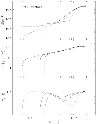 Indeed Smak (2004) presented a much more reliable approach of calculating the effects of irradiation of the secondary. He simplifies the problem by making the reasonable assumption of isothermal layers inside and outside the shadow zone and solves the equation of motion. He finds that the enhanced mass transfer due to irradiation of the secondary appears efficient in systems with short orbital periods, i.e. hr. Interestingly, the amount of mass transfer enhancement derived by Smak for typical SU UMa parameter (/) is very similar to the one assumed in our calculations. During outburst we obtain accretion rates of gs-1. With an efficiency of (Eq. (4)) and gs-1 this leads to a mass transfer enhancement of /. In addition, the values derived from observations are also similar, e.g. Vogt (1983) derived / for VW Hyi.