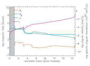 For illustration, we consider in some detail the evolution of the model with standard parameter settings. Table 1 shows that, over the course of the entire evolution, the total angular momentum enclosed by fiducial spheres of mass coordinate , , and decreases in the magnetic models by a factor of 100 to 200, far more than in the non-magnetic comparison model. In both cases most of the angular momentum transport occurs prior to carbon ignition (Figs. 2 and 3). The greatest fractional decrease occurs during the transition from hydrogen depletion to helium ignition (Table 1, Fig. 2) as the star adjusts to its new red giant structure. During this transition, the central density goes up by a factor of about 100 (from to ) with an accompanying increase in differential rotation and shear. Though the angular momentum evolves little after carbon burning, modified only by local shells of convection, there is a factor of two change after carbon ignition (central temperature = ).