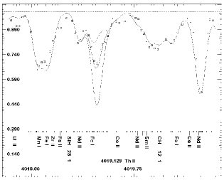 A special effort was later dedicated to the observation of an increasing number of Th-rich halo stars (see for example Johnson & Bolte, 2001). But the number of lines considered for the abundance determination did not necessarily increase; for example the latest investigation of Honda et al. (2004) is based on the single 4019 Å line. Numerous thorium lines were detected only in the four above-mentioned Th-rich stars.