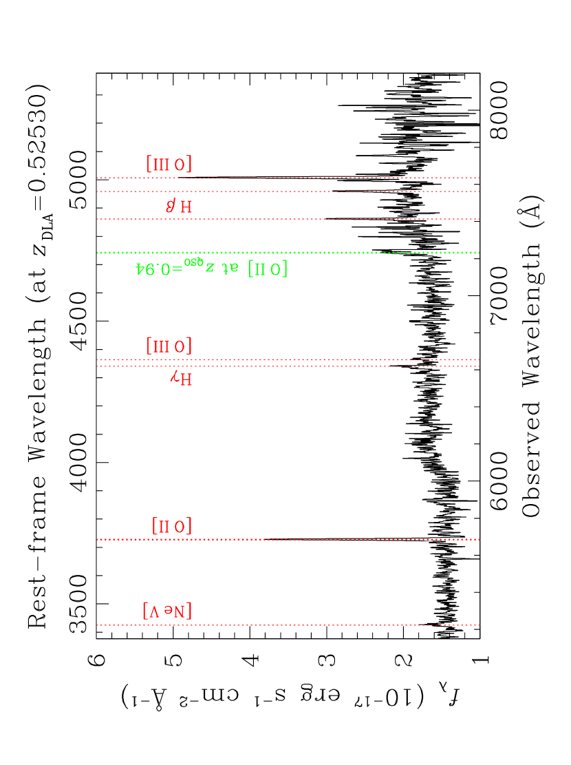 The summed, extracted spectrum of the DLA galaxy covers 3400–5400 Å and is presented in Figure 11. The galaxy displays multiple emission features such as [O II] and H, as well as a moderate 4000-Å spectral discontinuity. These spectral features indicate a combination of an evolved stellar population and ongoing star formation in the ISM of the DLA galaxy. Line flux measurements of the identified emission features are presented in Table 8. [O III] emission is not detected, so we present a 3- upper limit (over a resolution element Å) to the line flux. At the same time, the [O III] emission feature appear to be uncharacteristically strong. But because this feature coincides with the telluric A-band absorption, the observed emission-line flux is subject to a large systematic uncertainty after correcting for the atmosphere absorption. The line luminosity of [O III] in Table 8 is therefore derived based on the expected 1:3 line flux ratio between the two [O III] forbidden transitions and the observed limit to the [O III] line luminosity. The redshift of the galaxy is .