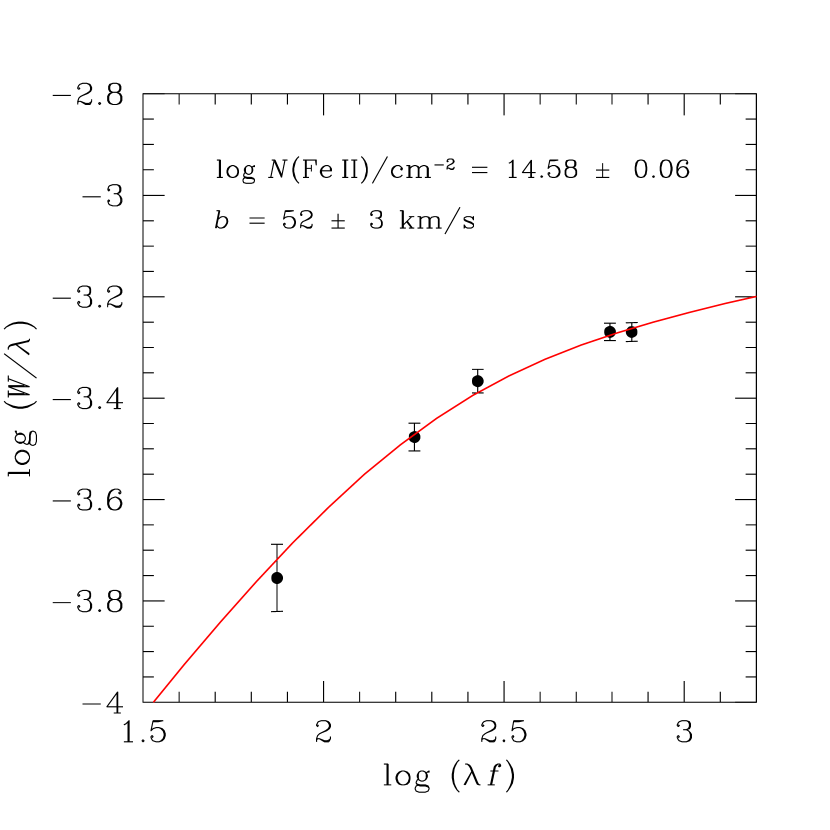 We first estimated and the velocity width of Fe II based on the absorption equivalent widths of five Fe II transitions published in Bechtold et al. (2002). The results from a curve-of-growth analysis are presented in Figure 2. We derived a best-fit for a velocity width of . The errors represent the 95% confidence interval. The large best-fit suggests that there are multiple absorbing components in the gaseous cloud that are not resolved in the low-resolution FOS data. The top five panels of Figure 3 shows a comparison between the five observed Fe II absorption profiles and Voigt models produced using the best-fit , , and the respective oscillator strengths. Despite the low resolution of the QSO spectrum, our Fe II column density estimate based on a curve-of-growth analysis is correct (Jenkins 1986).