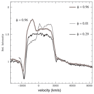At , the system is near conjunction with the O star in front of the WC7 star, so we expect the compressed WC7 material to be flowing towards us. At the same time, we are viewing the two stars mostly through the wind of the O star, accounting for our observation (Fig. 1) that the absorption component of the He i line is weaker than at phases when the stars are observed through the He-rich WC7 stellar wind. At this phase, the angle between our sightline and the axis joining the two stars is smaller than the opening angle () of the wind-collision ‘cone’.