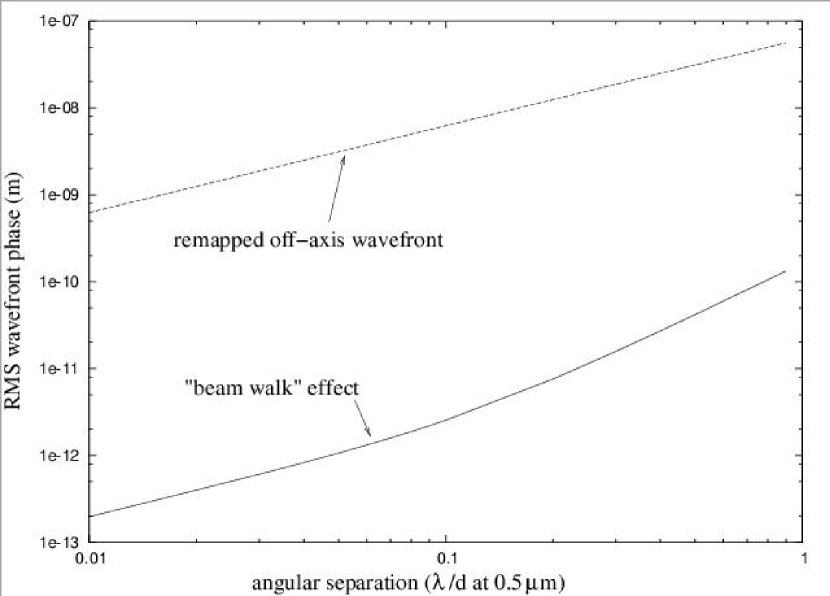 We have measured, through numerical simulation (3D raytracing on the surface of the optics), the deviation from “perfect” pupil remapping in a real system. The main effect produced by beam walk is to superimpose a low-order phase mode on the wavefront exiting the PIAA system. As shown in fig. 8, the RMS amplitude of this mode increases with the source’s angular separation from the optical axis. For separations below , the phase aberration induced by the beam walk effect is about 3000 times smaller than the remapped tip-tilt phase map. This effect has therefore no significant impact on the sensitivity of the PIAAC to angular stellar size and pointing errors.