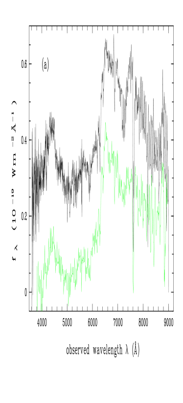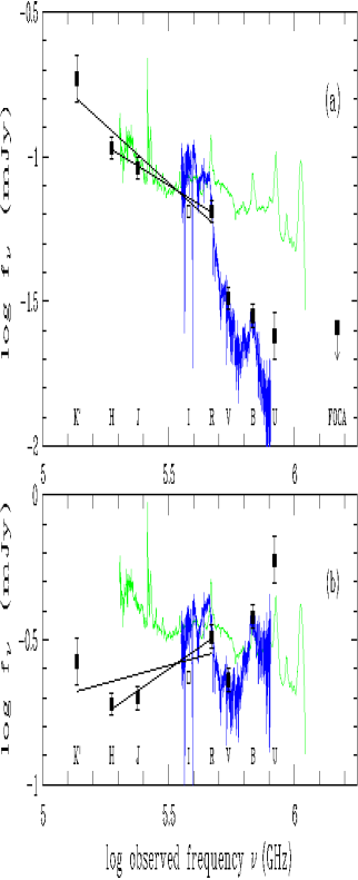 The resulting broad-band SED is shown in Fig. 3a. The uncertainty due to variability is expected to be small. However, we caution that changes in flux cannot be ruled out. The B band lightcurve from the VPMS data shows a dimming by 0.8 mag between 1970 and 1990 but only small fluctuations between 1990 and 2003. A similar behaviour is indicated by the UVR data. (The dimming is stronger at shorter wavelengths, as is typical for quasars, cf. Trévese et al. Tre01 (2001)). Fig. 3 reflects the depression of the continuum seen in Fig.1 a. We restrict the power-law approximation to Å (observed) and find = from the linear regression of the K′HJR magnitudes. If we exclude the K′ data point (it is not clear whether the turnup at 2.2 m is real), the fit is considerably improved and the slope = comes close to the slope of the composite spectrum from all VPMS quasars.
