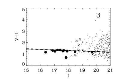 For 29 of the 32 systems analysed here, -band images were also available, thus allowing us to construct and investigate the CM diagram of the “cluster” members. The CM diagrams were constructed considering galaxies within a radius of and are shown in Fig. 11. For each system: 1) the left panel gives the aforementioned colour-magnitude diagram for galaxies (dots) brighter than ; filled circles indicate spectroscopically confirmed members and crosses other galaxies with measured redshifts. Also shown in this panel are the best-estimated loci characterizing the so-called red sequence (see below) as determined from the photometric data alone (dashed line) and that obtained considering only the confirmed spectroscopic members (solid line); 2) the middle panel shows the background-corrected colour distribution of galaxies brighter than within the same radius. The background correction is estimated from the colour distribution of galaxies lying between radii and ; and 3) the right panel shows the colour distribution of spectroscopic members (solid histogram) and that of all galaxies with measured redshifts (dotted histogram).