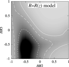The conversion from the 3D-KS test statistic, , to the probability that two samples were taken from the same underlying population, , is strongly dependent on the number of sources in the tested samples, and the degree of correlation between the tested variables. Fasano & Franceschini (1987) numerically generated lookup tables to allow this conversion at a number of confidence levels, for a range of sample sizes, and values of the correlation parameter. However, these tables give only a relatively small number of conversion values, at discrete confidence levels, sample sizes, and values of the correlation parameter. Therefore, we have run a set of simulations, the results of which permit conversion from directly into conversion using the precise sample sizes and correlations seen in the sample. We calculated the three-dimensional probability density map (3D-PDM), of the sample in (HR1,HR2,HR3) space. The contribution from each source to the 3D-PDM is calculated from a 3D-Gaussian that has widths equivalent to ,, and . The normalisation of the 3D-Gaussian is set such that the total contribution of each source is unity. This 3D-PDM is used to generate pairs of random populations, having 217 and 25000 members respectively, for which is calculated. The latter step is repeated for 100000 iterations. The equivalent probability for any particular value of the 3D-KS statistic, is equal to the fraction of these iterations having greater than this value. The absolute lower limit at which we can evaluate the probability is given by the reciprocal of the number of simulation iterations, i.e. 0.001%, although the errors are large at this level. This limit is determined by the processing time available. Table 1 shows , for the eight models, and for both of the tested spectral models. In order to determine where the biggest differences arise between the data and models, we have calculated the KS probabilities (), separately for each of , and , the results of which are also shown in table 1.
