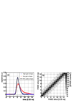 In order to sample this pulse shape with the 300 MSamples/s FADC system [2], the original pulse is folded with a stretching function leading to a FWHM greater than 6 ns. To increase the dynamic range of the MAGIC FADCs the signals are split into two branches with gains differing by a factor 10. Figure 1a) shows a typical average of identical signals.