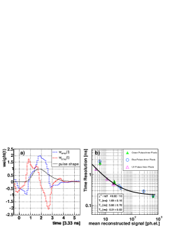where is the relative phase between and the FADC clock. Thus and are given by a weighted sum of the discrete measurements with the weights for the amplitude, , and time shift, , plus . To reduce the fit can be iterated using and the weights [4, 8]. Figure 2 a) shows the amplitude and timing weights for the MC pulse shape. The first weight is plotted as a function of in the range , the second weight in the range and so on.