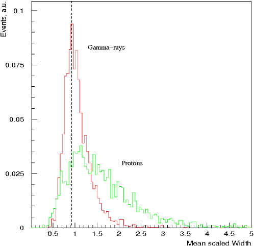 Exploitation of the HEGRA system of 5 imaging atmospheric Čerenkov telescopes with H.E.S.S. allowed us to conclude that the most effective parameter of cosmic ray discrimination by the image shape is a parameter of mean scaled Width (m.s.w.). At least with two telescopes operating in a stereoscopic mode one can reconstruct the impact distance of the shower axis from each of the telescopes, and scale the actual transverse angular size of the image with the total amount of light in the image (-parameter) at that impact distance. The distributions of the parameter of mean scaled Width for the simulated -ray and proton showers are shown in Figure 8. Despite a significant overlap between two distributions one can reduce the content of the proton showers by factor of (i.e. the ”after cuts” acceptance of cosmic ray showers is ) applying mean scaled Width cut of 0.91. This cut keeps 35% of all registered -ray showers. The corresponding quality-factor is Q-factor=. High fluctuations in the image of low energy events cause such rather modest rejection power. Simulations have shown that an application of any other additional parameter of image shape does not improve the resultant quality factor.