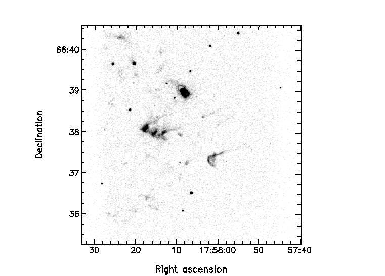 The above arguments suggest a very straightforward explanation for the puzzling brightness difference between the bright knot and other halo structures in NGC 6543 (see Fig 1). The knot the is densest part of the halo and widespread recombinations lead to a large surface brightness; essentially all of the incident ionizing photons are absorbed and re-emitted. Meanwhile, the lower density of the other features in the halo mean that they are already fully ionized or recombinations are insignificant. Using the flux value above, and an ionized layer of then from Figure 1 of Henney (2001), we require that the ionized gas around the knot have a density while the other halo features must be less dense than this. It would be interesting to use the [S ii] doublet to measure the local electron density in the knot and the other halo features.