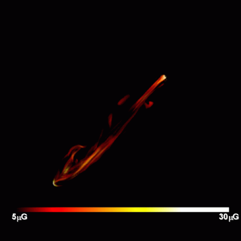 Just as we have seen for the thermal energy generation, Figures 7-11 show that the total magnetic energy increases exceed in each model the magnetic energy represented by the jet Poynting flux. Early in the simulations this excess is typically a factor of two or so in each case. Except for the LU simulation the relative magnetic energy enhancement increases to at least a factor of five by the end of each simulation. Just as it was for shocks, the distributions of magnetic fields are rather different, despite the similar energetics. This is illustrated by the contrasting magnetic field distributions in the HU and HK simulations shown in Figures 15 and 16 (and the associated animations). Those differences derive from the same dynamical distinctions mentioned in reference to shocks. Most of the magnetic field enhancements can be traced to compression events in the flows (especially shocks), followed by flux stretching.