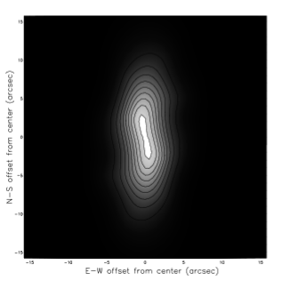 where . We used the implementation of the TPS provided by the Interactive Data Language (IDL) environment. Since Vijh et al. (2005) provided BL measurements on two long slits both south of the central source, in the interpolation we assumed the BL emission to be symmetric for inversion. In order to obtain a sensible asymptotic behaviour of the extrapolated BL, we built the TPS on the logarithm of the BL surface brightness, instead of the BL itself. Hence, in Eqs. (14) and (15) and are the angular offsets from the central source of the RR, and is the logarithm of the corresponding integrated BL. Figure 1 shows a surface plot of the resulting TPS which, despite the small number of data points from which it was obtained, clearly shows the geometry of the RR nebula.