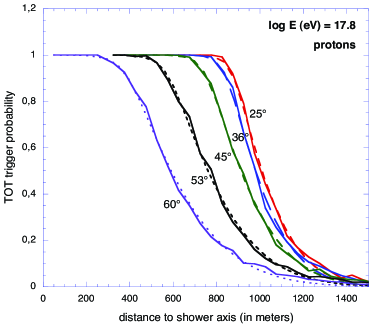 Examples of LTP functions are shown in Fig. 1 for proton showers simulated with the Corsika Monte-Carlo program[2] using the QGSJet hadronic model[3], for different primary energies and zenith angles. Obviously, the trigger probability is 1 close to the shower core and 0 far away from it. The transition radius, , such that is an increasing function of energy (as the shower gets bigger) and a decreasing function of (as the shower gets older). The transition region also grows from m at 25∘ to m at 60∘.