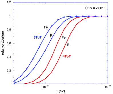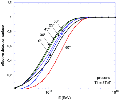 where implements the T5 condition and is equal to either 1 or 0, depending on whether the core position is allowed or not. Results are shown in Fig. 2a for the same proton showers as above, as a function of energy: saturates at EeV for moderately inclined showers, and EeV for showers at or . Finally, the aperture is obtained by integrating over solid angle: . Results are shown in Fig. 2b for two different choices of the T4 condition: at least 3 or at least 4 stations with a ToT trigger. The latter thus requires one more tank and is then less efficient at low energy. Figure 2b also shows that the SD array is more sensitive to Fe nuclei than to protons at low energy, which can be used to constrain the primary composition of CRs in the astrophysically important region of the ankle. The SD detection efficiency is 1 above 3 EeV and 7 EeV for the 3ToT and 4ToT triggers, respectively.