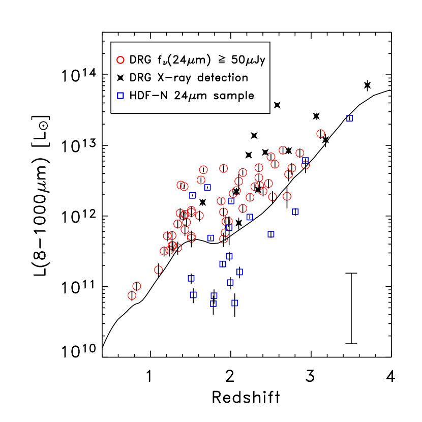 Several of the DRGs (6/152) have IR luminosities, (so–called Hyper luminous IR galaxies, HyLIRGs). These IR luminosities are comparable to those of PG quasars at , which have warm thermal dust temperatures (Haas et al., 2003). Locally, HyLIRGs — and many ULIRGs with have rest–frame optical emission spectra characteristic of Seyfert galaxies (e.g. Soifer et al., 1995; Veilleux et al., 1995; Sanders & Mirabel, 1996; Veilleux et al., 1999), and the IR emission possibly originates from AGN processes. We suspect that the most IR–luminous DRGs may have a contribution to their bolometric emission from AGN. The majority (5/6) of the DRGs with inferred are detected by Chandra, compared to the 10% X-ray–detection fraction over the whole sample. This X–ray detection fraction is consistent with the limit on the AGN fraction for the coeval sub–mm galaxies (Alexander et al., 2005), a source population that also has inferred . HyLIRGs are also present in high–redshift IRAC–selected AGN samples, and % are undetected in deep X–ray data (Alonso–Herrero et al., 2005). Therefore, the X–ray emission from AGN in many of these IR–luminous objects may be attenuated by dust below the detection limit of the surveys. However, if AGN contribute to the emission in DRGs with , then we may be overestimating the galaxies’ IR luminosity. Although the Dale & Helou (2002) IR templates include galaxies with , using a template for Mrk 231 with a known AGN and warmer dust temperature would reduce the inferred IR luminosity by factors of 2–3. To limit the effects of any bias caused by IR template uncertainties for the highest luminosity DRGs, we consider below how restricting our sample to galaxies without X–ray detections, , and IR colors indicative of AGN (see § 6.3) affects our analysis.