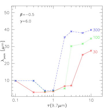 Another important parameter that can be used to characterize a model solution is , the wavelength at which the IR emission – expressed as – peaks. In Fig. 8 this parameter is shown against the optical depth and for the three torus sizes for which the model has been computed. Only type-2 (equatorial view) emission is shown here. The peak wavelength ranges from µm, corresponding to the presence of a strong silicate emission in models with low optical depth, to about µm obtained in the models with the largest outer radii and optical depth values.