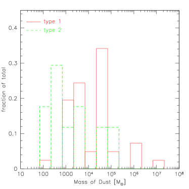 For the large majority of cases, the values of the mass of dust range from few tens to few tens of thousands solar masses, orders of magnitudes lower than the typical masses of supermassive black hole. Striking exception is again the mass of dust computed for IRAS 16347+7037 found to reach M⊙.